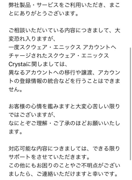 一応ダメ元でスクエニさんにお問い合わせしたのですが、もちろんCrystaの移行などは不可能と。