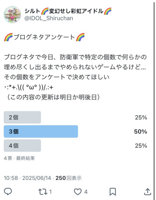 Xの方でアンケート取りまして3個になりました!!