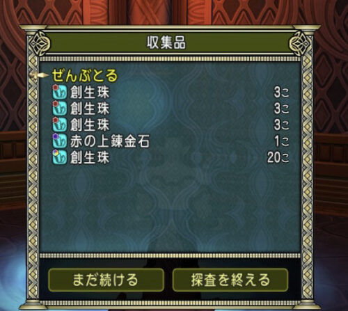あとあれですね。普通にボスを周回するより、毎回戻って道中の敵倒して周回した方が創生珠の時間効率は良いのかな!?