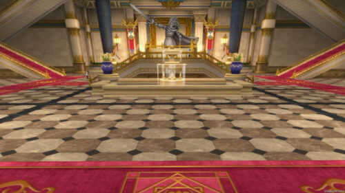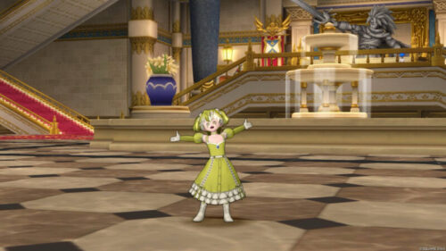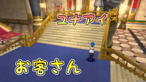 流れとしては最初集合写真を撮りまして、奥の方の勇者の像がある前の青いじゅうたんの場所へ行きます。
